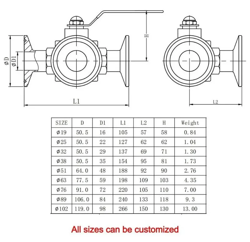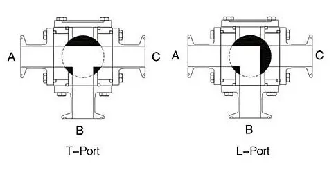 Three Way Sanitary Ball Valve has a full port design to reduce turbulence and pressure drop through the valve. The hygienic design is widely used in the field of food processing, beverages, fruit juices, wine. There are 2 ball cores: L-Port and T-Port.