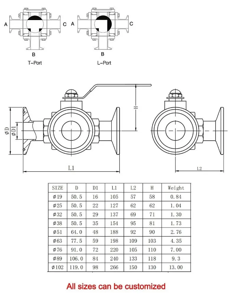 Sanitary Three Way Non-retention Ball Valve with hygienic design meet high requirement standard, offers small torque, full degreasing, sealing elastic compensation, no retention, no dead angle, easily maintain, with very flexible combination configuration. Body Material is Stainless 304 or 316L, suited to use in water treatment, food & beverage processing, pharmaceutical, daily chemical, industrial fluid applications. Connection End with tri-clover/clamp, weld or thread.