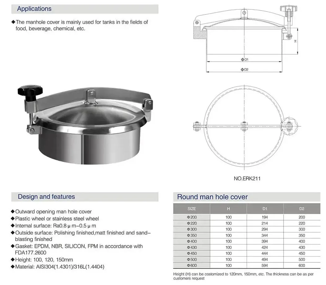 Sanitary Round Manways are made in stainless steel T304, T316L, it is one of mainly type of tank manhole cover. Sanitary round manway is mainly applied for the tanks and vessels of food, beverage, chemical etc. Wellgreen sanitary offers a full line tank manways to processing equipment, to meet you every needs of hygienic industries.