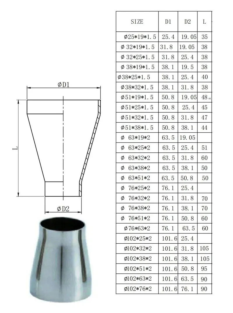 Aohoy offers a full range of stainless steel Sanitary Weld Concentric Reducers. These stainless steel sanitary welded concentric reducers are suitable for permanent installations of process piping and equipment that can be cleaned in situ (CIP) without requiring removal from the system.