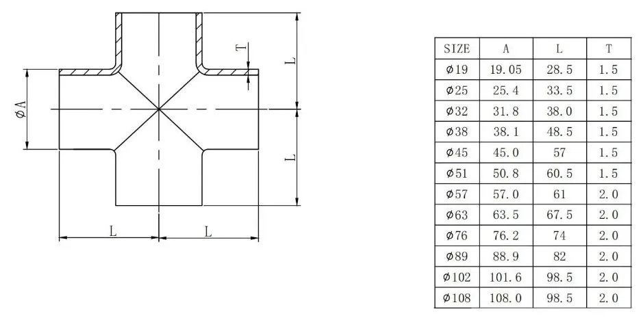 Sanitary Weld 4-Way Cross Tee allows for seamless connections in piping systems. Each series offers four common installation methods: welding, clamping, threading, and flanges, ensuring compatibility with your piping system's standard connections. Suitable for piping systems in the food, beverage, pharmaceutical, and chemical industries.
